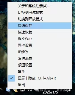 在发送端保护模式下,通过【进入系统】登录操作系统,完成所需的数据更新操作(如安装软件、拷贝教学文件、安装系统补丁等); 数据更新完成后,无需关闭操作系统,直接右键点击桌面右下角系统托盘的三茗机房管理系统图标,选择下图【快速保存】,对更新后的差异数据进行保存;