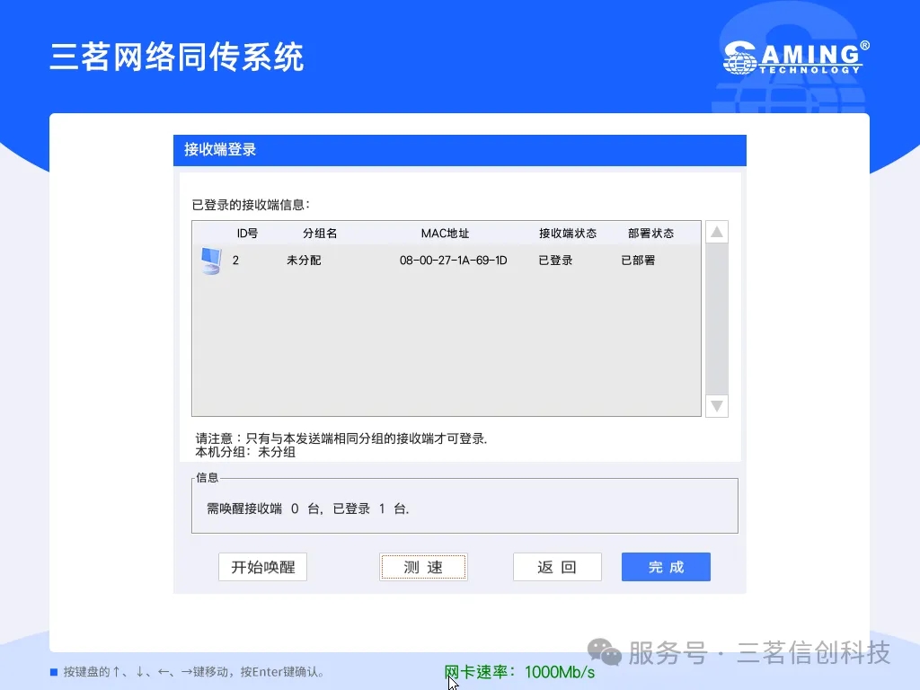 保持发送端界面不变,切换至接收端操作。 依次打开接收端电脑,进入同传界面后自动连接到发送端,完成登录后会显示“登录成功”提示; 所有接收端均登录完成后,返回发送端界面,此时界面会显示已登录的接收端列表,核对接收端数量与实际机房设备数量一致。