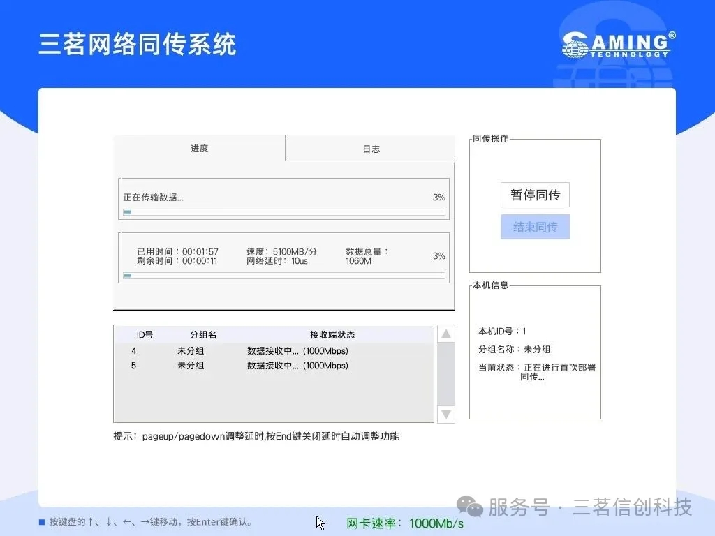 同传过程中不可关闭发送端或接收端电源,不可断开网络连接。 当发送端界面显示“增量同传完成”提示时,系统会自动对所有接收端的增量数据进行一次快速保存,无需手动操作; 保存完成后,所有接收端会自动重启进入系统;