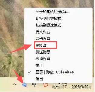 2、Windows 下修改:系统开始菜单下找到网络控制工具IP修改工具,或者在右下角学生端图标点击右键选择IP修改选项也可以设置。