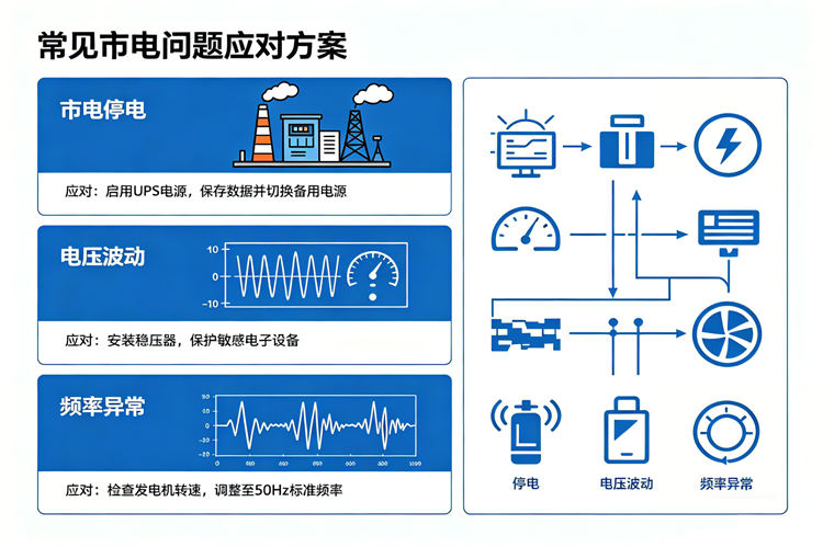 常见市电问题主要包括电压偏差、频率偏差、谐波干扰、三相不平衡、持续高低压、频率漂移及高压尖脉冲等‌,这些问题可能引发电力设备运行异常、效率下降甚至损坏。以下是针对各类问题的应对方案对照表: