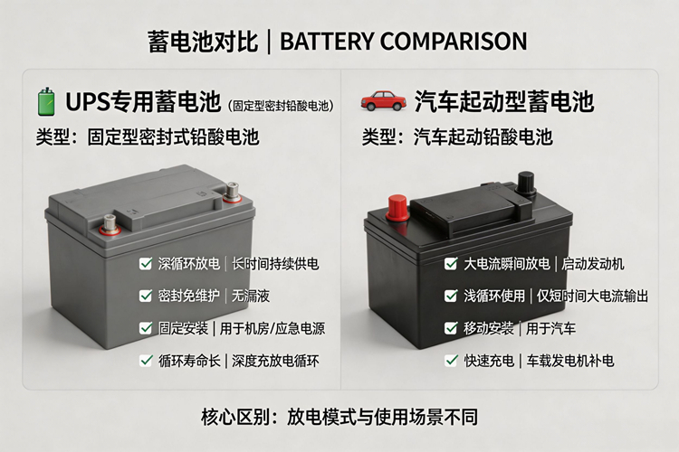 汽车起动型蓄电池:侧重瞬时大电流启动性能与循环次数,自放电率较高,若用于UPS会导致待机时间短、寿命大幅缩短,切勿混淆选用。选购时需明确标注 “UPS专用”,避免用其他类型蓄电池替代。
