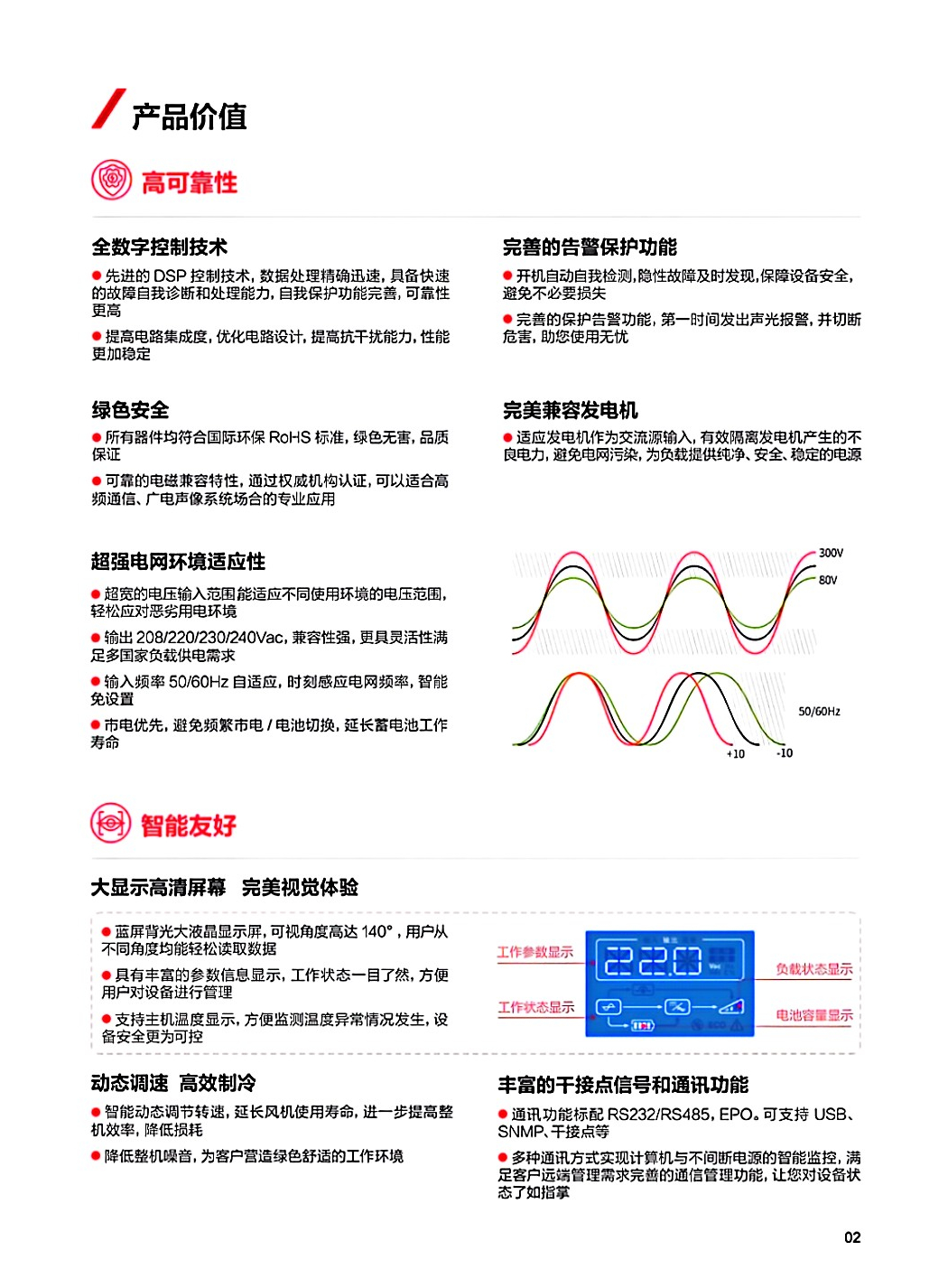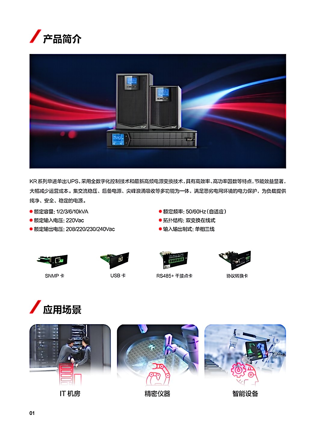 科华 KR11 系列单进单出 UPS,采用全数字化控制技术和最新高频电源变换技术,具有高效率、高功率因数等特点,节能效益显著,大幅减少运营成本。集交流稳压、后备电源、尖峰浪涌吸收等多功能为一体,满足恶劣电网环境的电力保护,为负载提供纯净、安全、稳定的电源。
