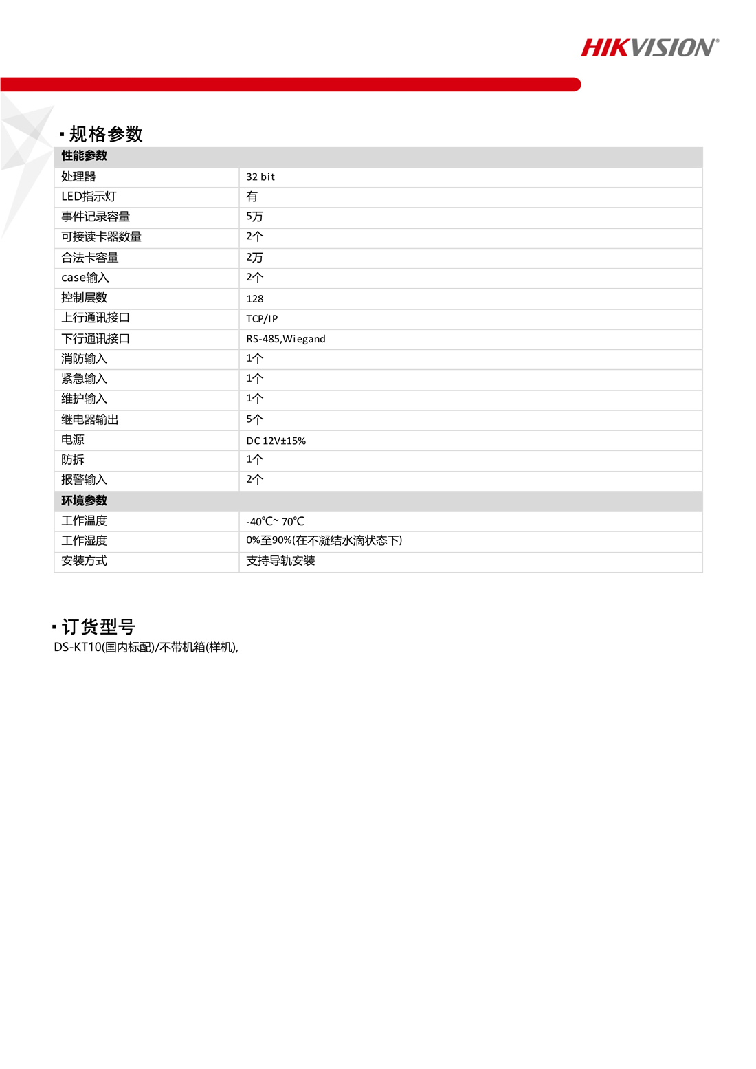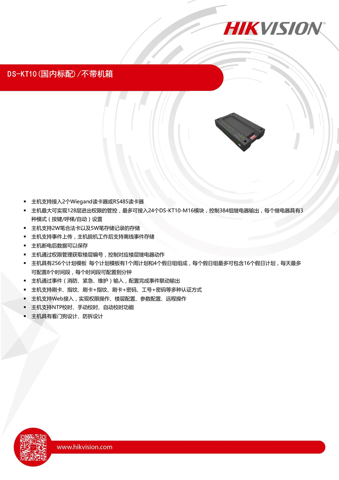· 主机最大可实现128层进出权限的管控,最多可接入24个DS-KT10-M16模块,控制384组继电器输出,每个继电器具有3种模式(按键/呼梯/自动)设置