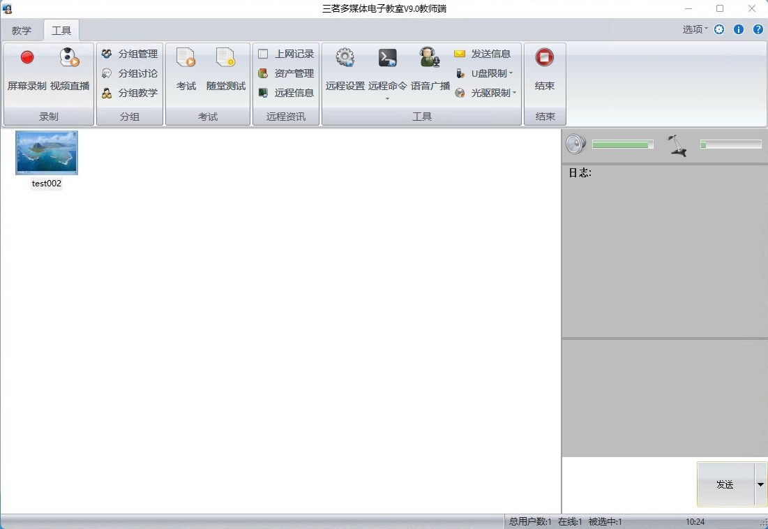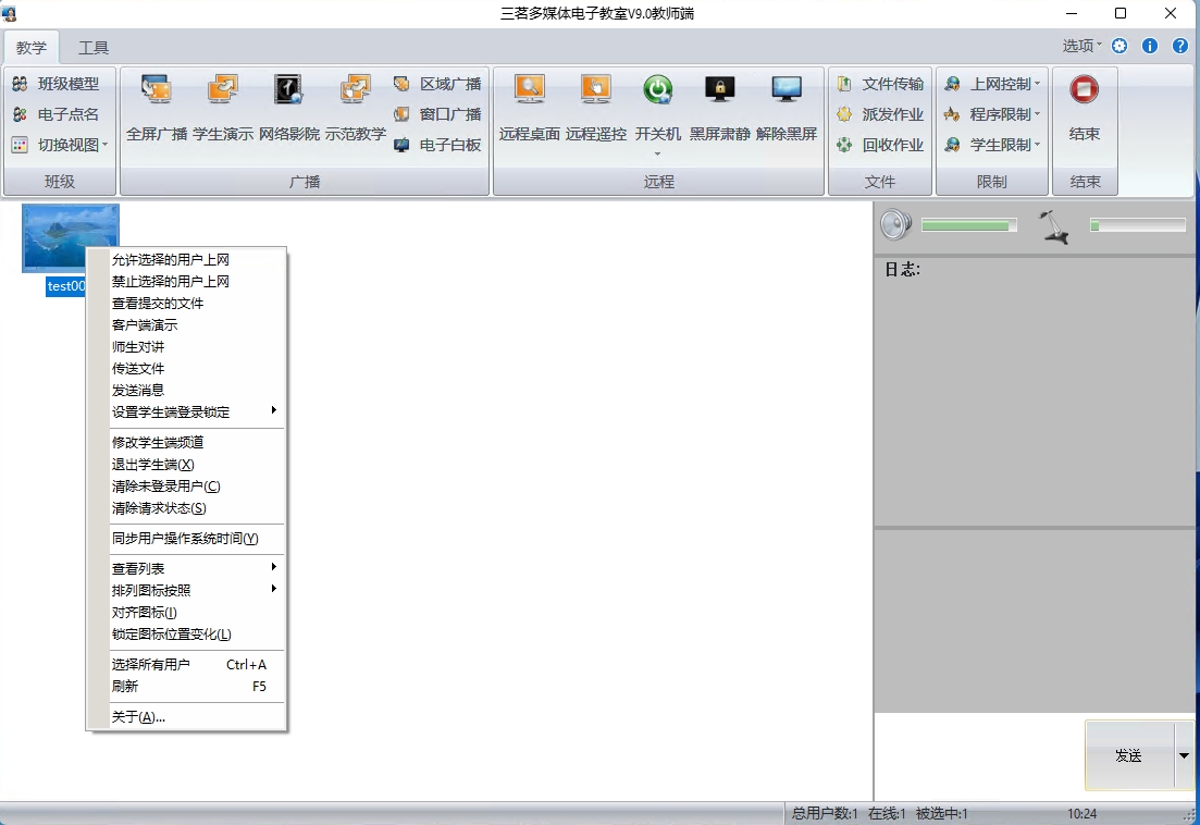 全屏广播: 向学生端广播教师端的声音或图像,教师端电脑桌面图像在学生端电脑屏幕上全屏显示。